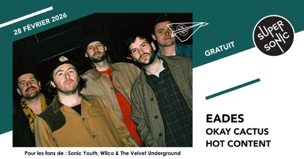 Eades • Okay Cactus • Hot Content février 28 / 19h00 - 23h00 SUPERSONIC 9 Rue Biscornet, Paris, France Si vous êtes fan de... Sonic Youth, Wilco & The Velvet Underground Gratuit